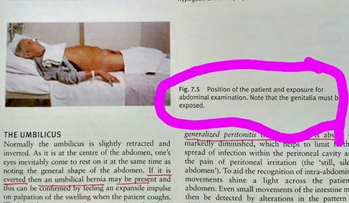 এই ছবিটা চিকিৎসা বিজ্ঞানের ক্লিনিক্যাল examination এর একটি রেফারেন্স বইয়ের যেখানে পেট ব্যাথা পরীক্ষা নিরীক্ষা নিয়ে এবং কতটুকু exposed করতে হবে তা আলোচনা করা হয়েছে ।